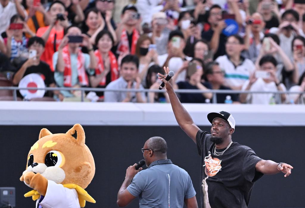 9月14日,牙买加短跑名将博尔特(右)现身日本东京国立竞技场。新华社记者 宋彦桦 摄