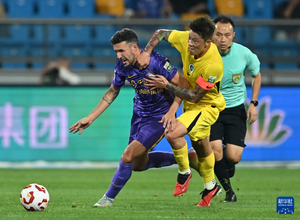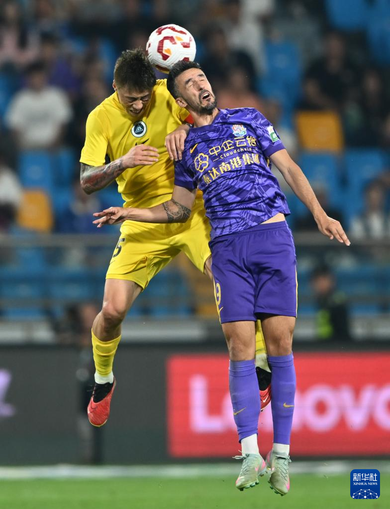 9月21日,天津津门虎队球员基莱斯(右)与深圳新鹏城队球员于睿在比赛中拼抢头球。