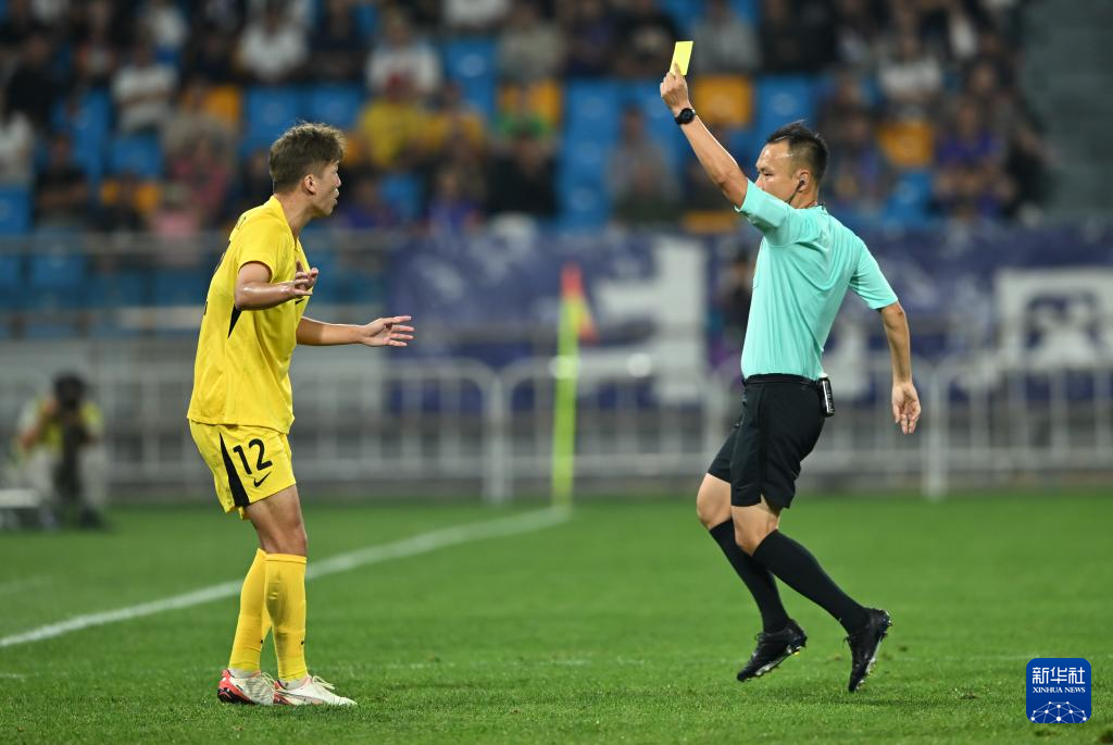 9月21日,主裁判王竞(右)向深圳新鹏城队球员张晓彬出示黄牌。