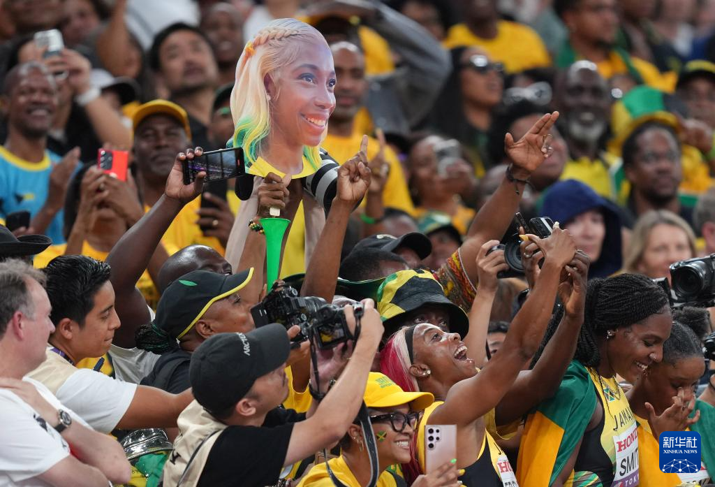 9月21日,亚军牙买加队选手弗雷泽(右三)在决赛后与观众自拍留影。