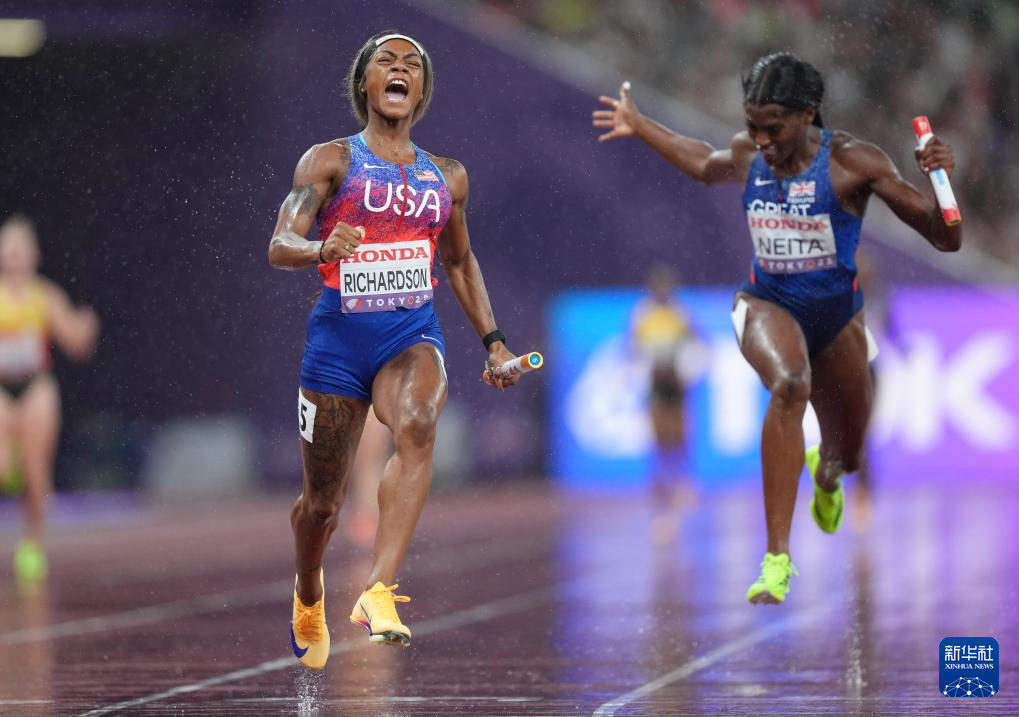 9月21日,美国队第四棒选手理查森(右)在决赛中冲过终点后庆祝。最终,美国队获得冠军。