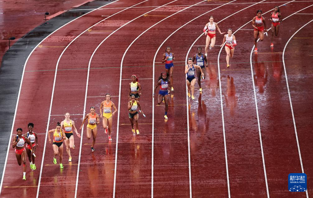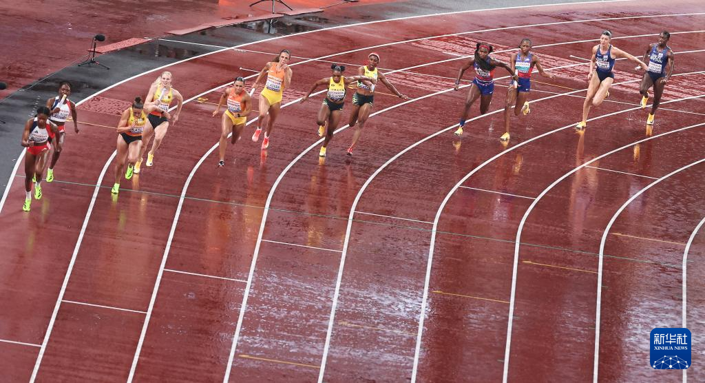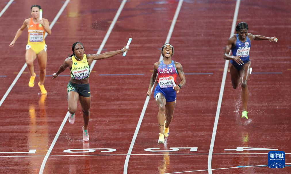 9月21日,美国队第四棒选手理查森(右四)、牙买加队第四棒选手史密斯(右六)和德国队第四棒选手吉娜(左二)在决赛中。最终,美国队获得冠军,牙买加队获得亚军,德国队获得季军。