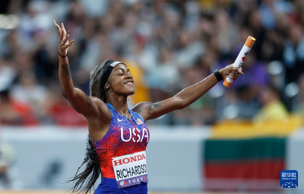 9月21日,美国队第四棒选手理查森在决赛中冲过终点后庆祝。最终,美国队获得冠军。