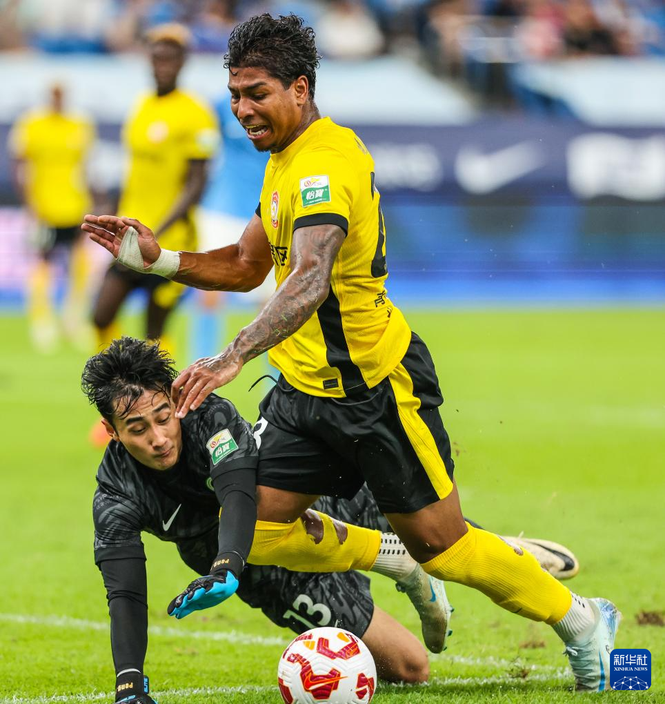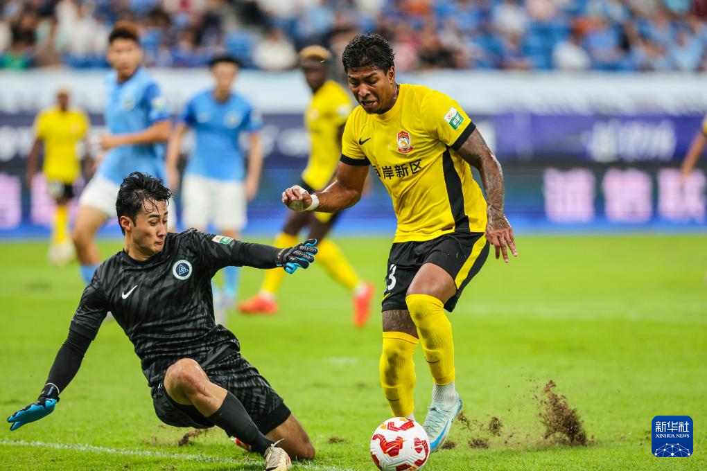 9月28日,深圳新鹏城队守门员彭鹏(左)在比赛中防守青岛西海岸队球员马特乌斯。