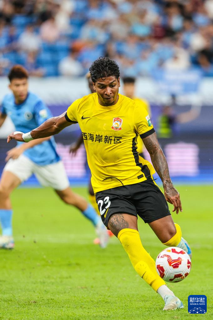 9月28日,深圳新鹏城队球员韦斯利(右)在比赛中射门。