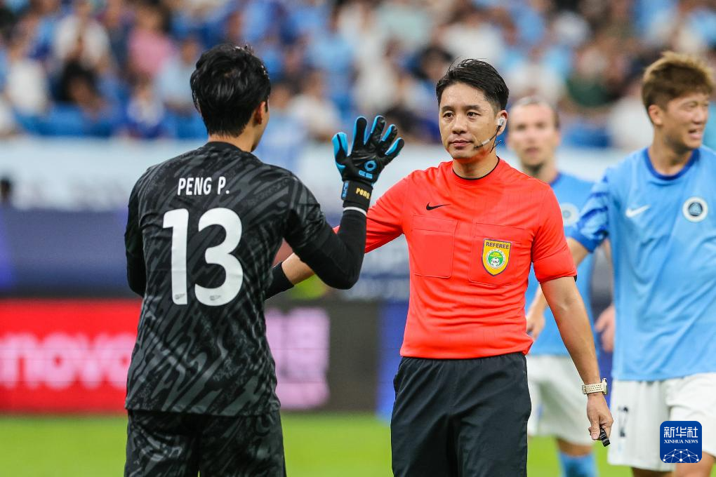9月28日,深圳新鹏城队守门员彭鹏(前左)与主裁判顾春含(前右)在比赛中交流。