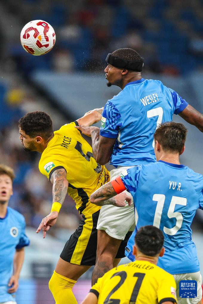9月28日,青岛西海岸队球员里切利(上左)与深圳新鹏城队球员韦斯利(上右)在比赛中争抢头球。