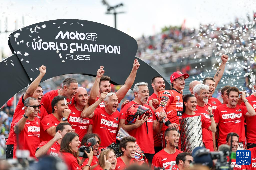 9月28日,本站亚军、赛季冠军杜卡迪车队西班牙车手马克·马奎斯和车队成员在颁奖仪式上庆祝。
