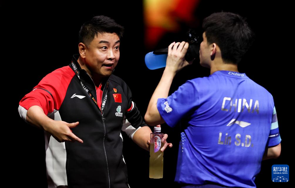 9月29日,教练王皓(左)在比赛间隙指导林诗栋。