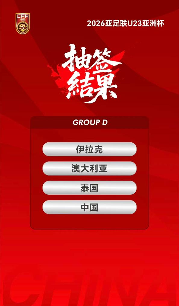 新华社北京10月2日电 2日,2026年沙特阿拉伯U23男足亚洲杯抽签出炉。中国队作为第四档球队,与伊拉克队、澳大利亚队、泰国队同分在D组。