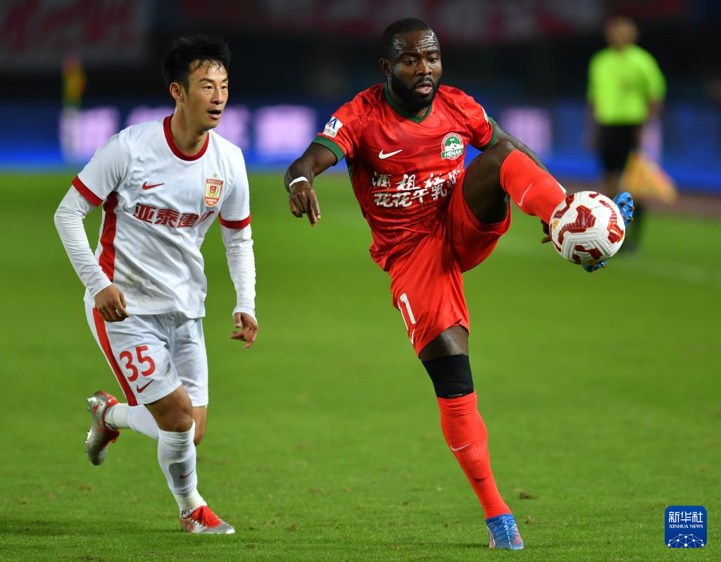 10月19日,河南俱乐部酒祖杜康队球员阿奇姆彭(右)与长春亚泰队球员彭欣力拼抢。