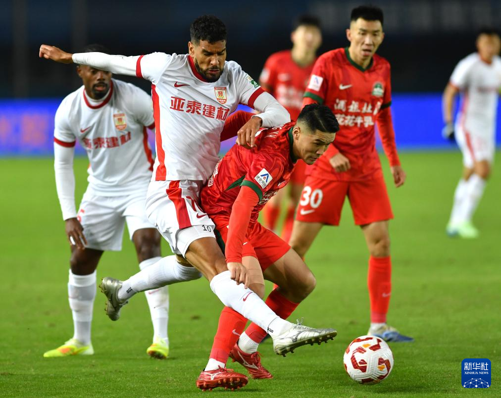 10月19日,长春亚泰队球员奥莫伊胡安弗(前左)与河南俱乐部酒祖杜康队球员钟义浩(前右)拼抢。