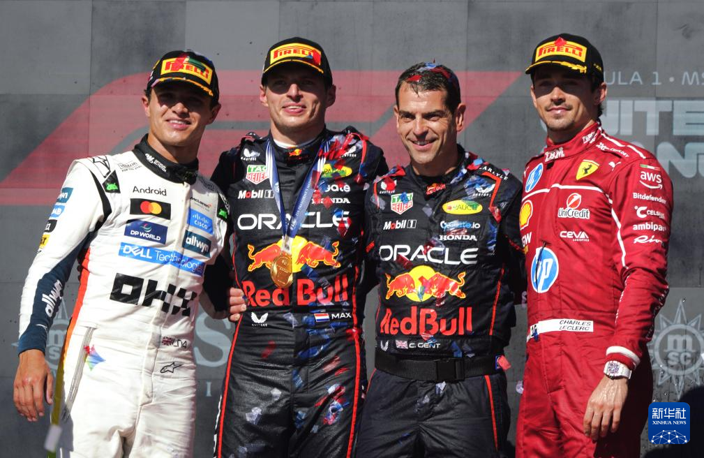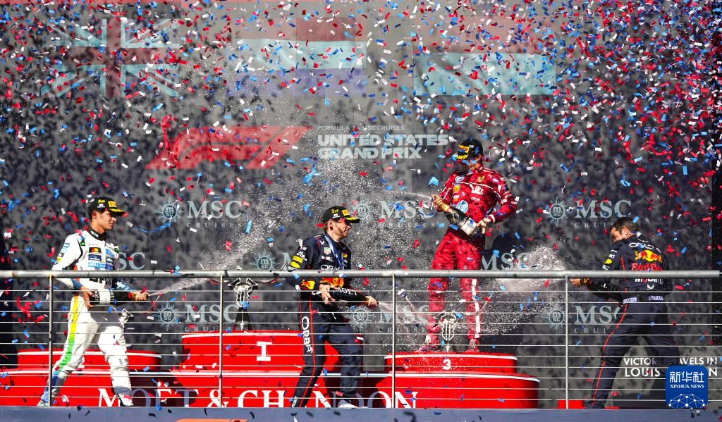 10月19日,冠军红牛车队荷兰车手维斯塔潘(左二)、亚军迈凯伦车队英国车手诺里斯(左一)和季军法拉利车队摩纳哥车手勒克莱尔(右二)在颁奖仪式上喷洒香槟庆祝。