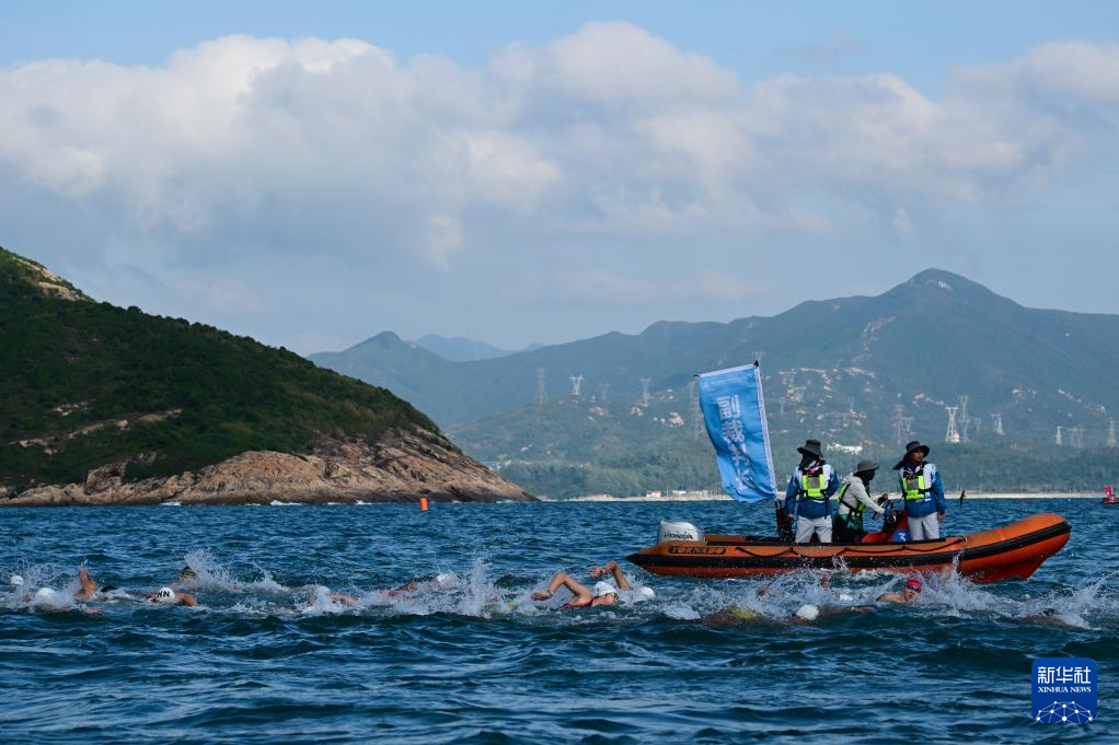 11月6日,香港队选手冼展霆在比赛中游过转弯浮标。