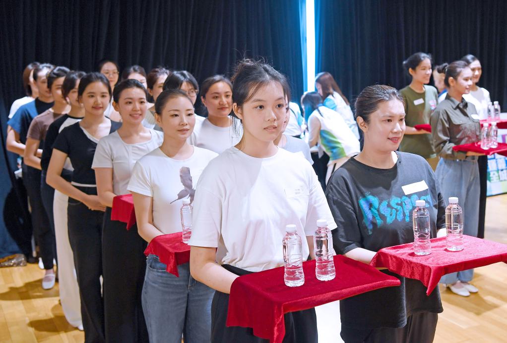 镜面墙前,数十位礼仪助理动作整齐划一,来自广州的国家高级礼仪培训师李静穿行其间,不时俯身调整学员的手势角度:“手位统一,步幅严格控制在30厘米,颁奖时才能展现最佳专业姿态。”