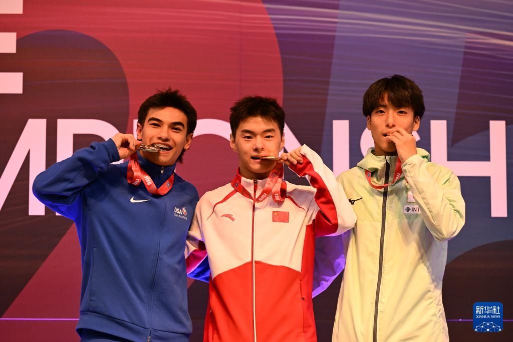 11月9日,冠军中国选手王梓赛(中)、亚军美国选手帕迪利亚(左)和季军日本选手宫野隼人在男子个人比赛颁奖仪式上合影。