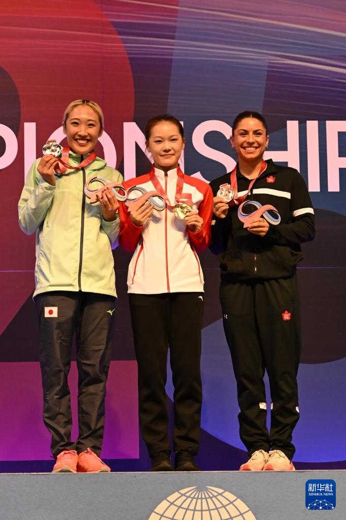 11月9日,冠军中国选手胡译乘(中)、亚军日本选手森光(左)和季军加拿大选手梅托在女子个人比赛颁奖仪式上合影。