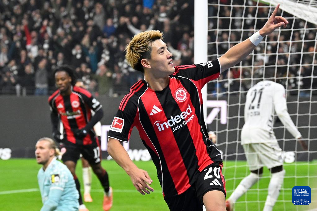 11月9日,法兰克福队球员堂安律庆祝得分。