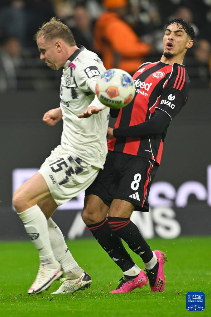 11月9日,法兰克福队球员布朗(上)与美因茨队球员姆韦内在比赛中拼抢。