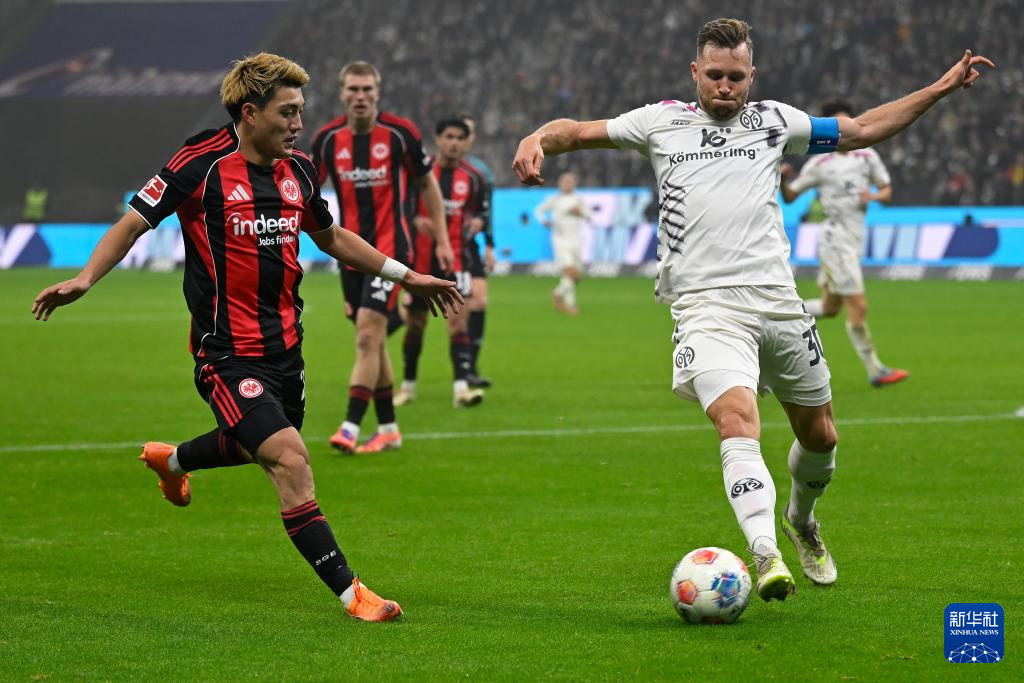 11月9日,法兰克福队球员堂安律(左)与美因茨队球员威德默在比赛中拼抢。
