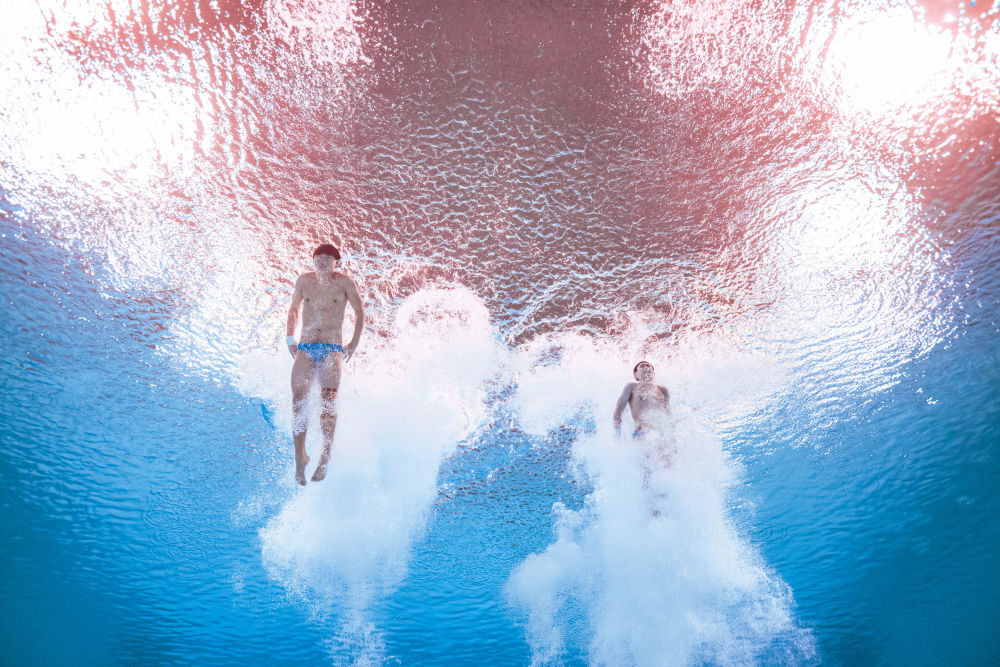 2021年7月12日,在陕西西安奥体中心游泳跳水馆举行的第十四届全运会跳水青年组男子双人10米台决赛中,陕西队组合白钰豪(右)/白钰鸣夺得金牌。新华社记者 张博文 摄