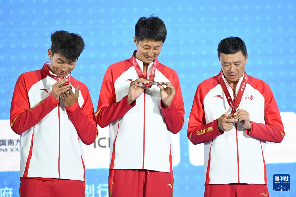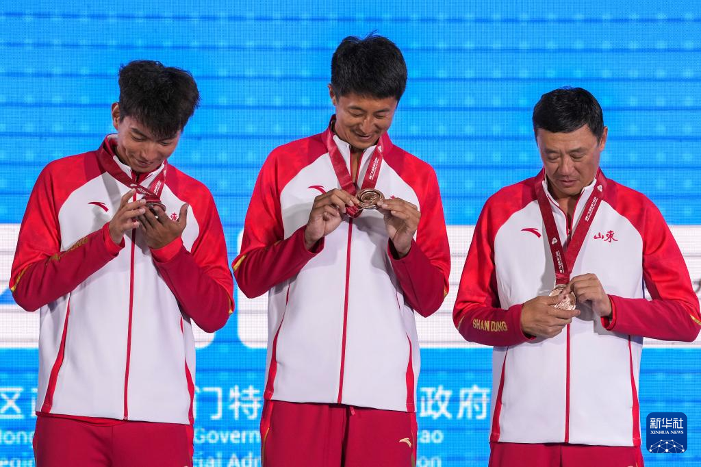 11月10日,获得季军的山东队组合王延伟(中)/杜鸿君(左)与教练在颁奖仪式上查看奖牌。