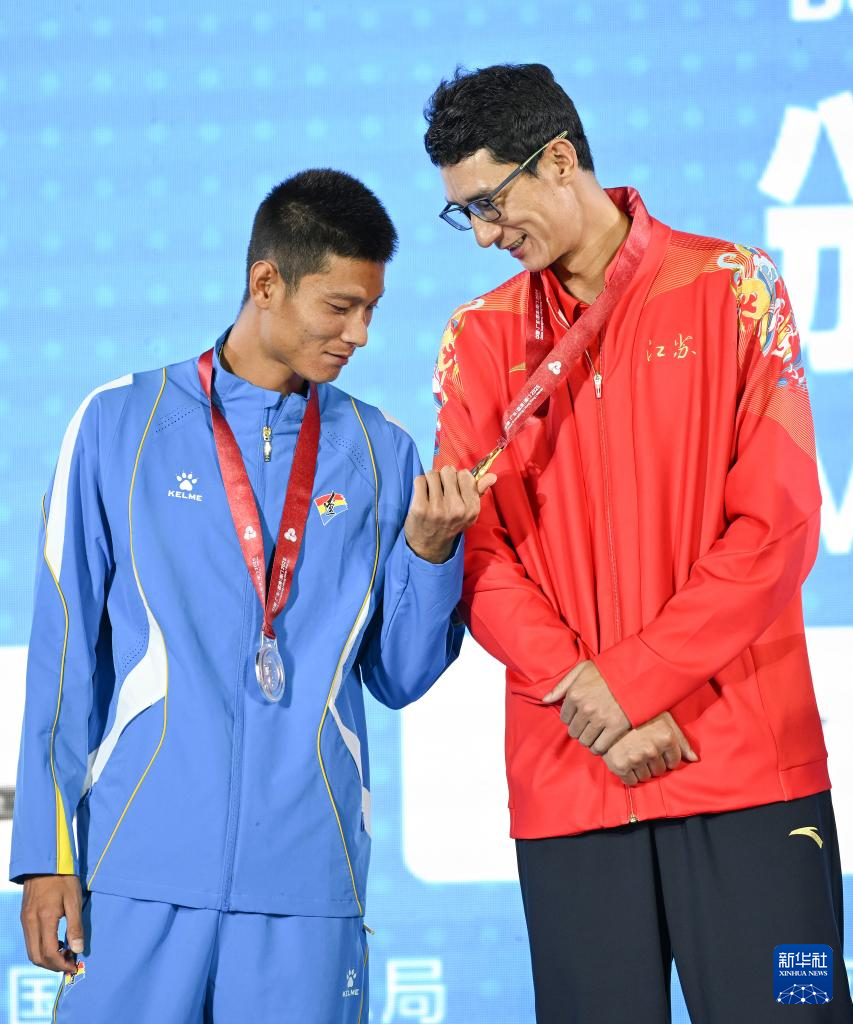 11月10日,获得银牌的辽宁队球员薛涛(左)查看江苏队球员吴佳欣的金牌。