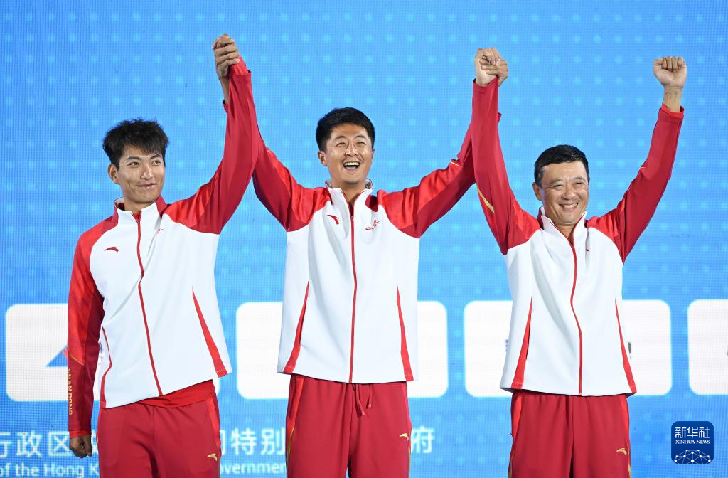 11月10日,获得冠军的江苏队组合吴佳欣(左)/周朝威(中)与教练在颁奖仪式上。