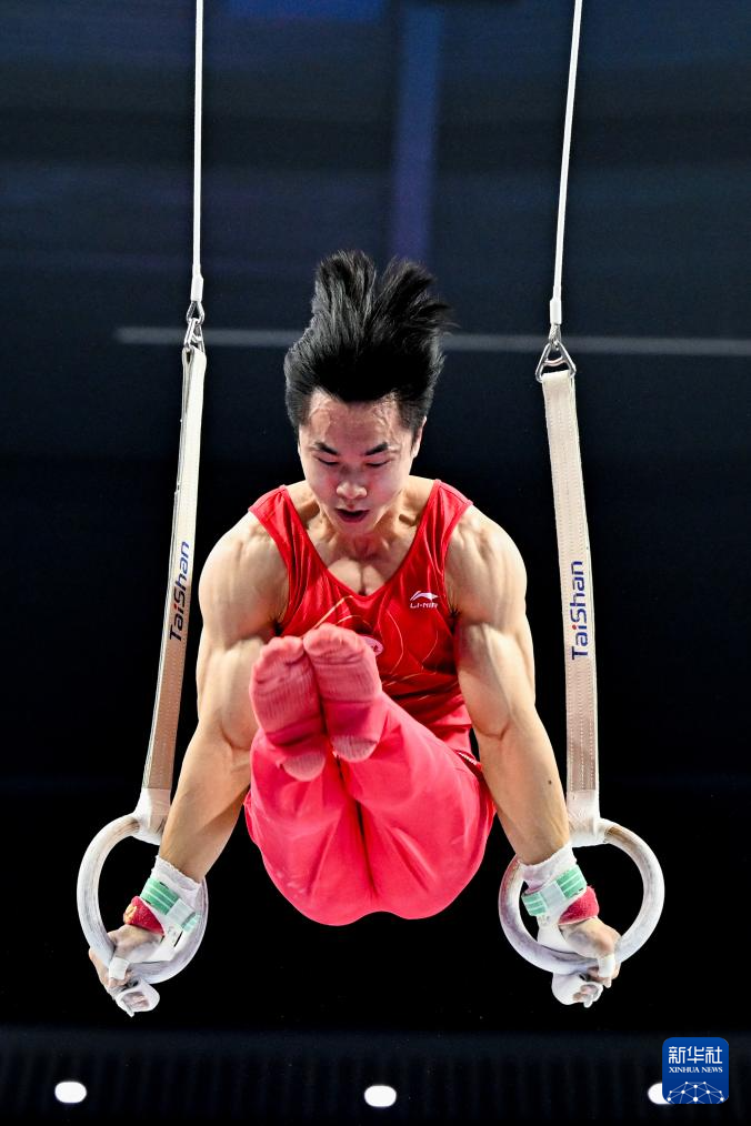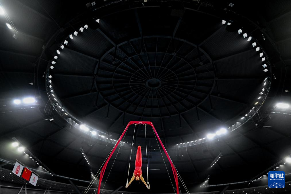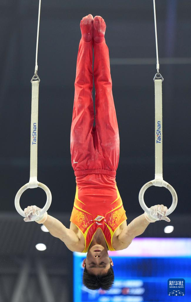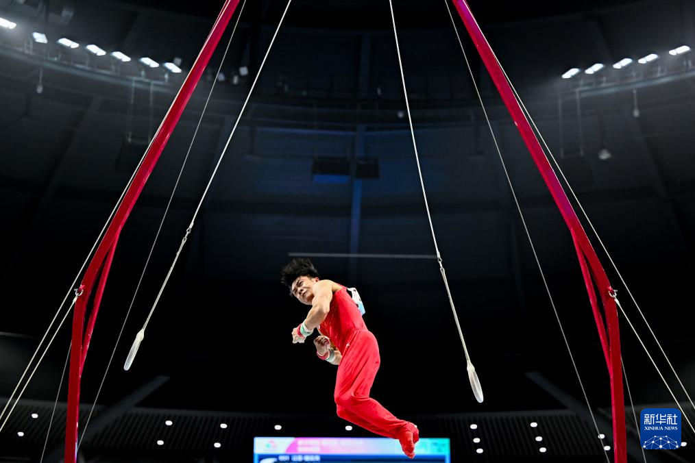 11月10日,湖南队选手张博恒在吊环比赛中。