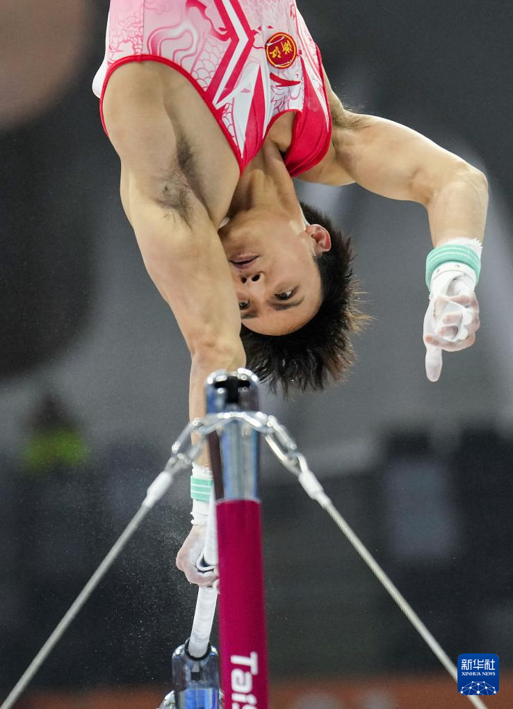 11月10日,江苏队选手何翔在双杠比赛中。