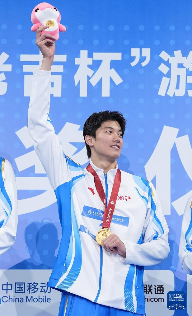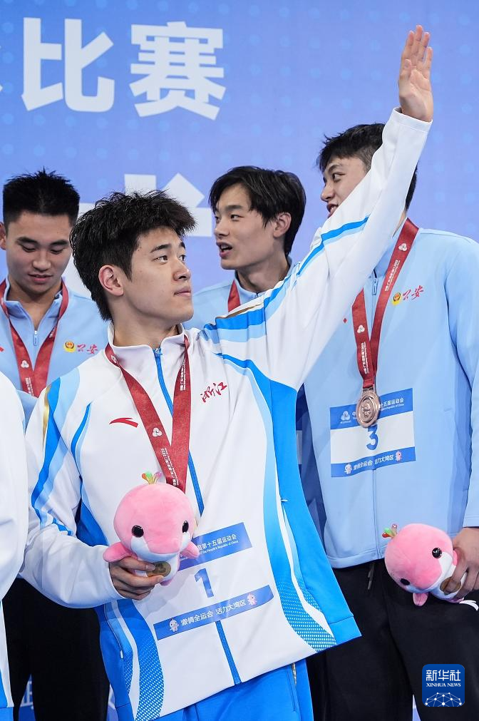 11月10日,浙江队选手潘展乐(前)在颁奖仪式上向观众致意。