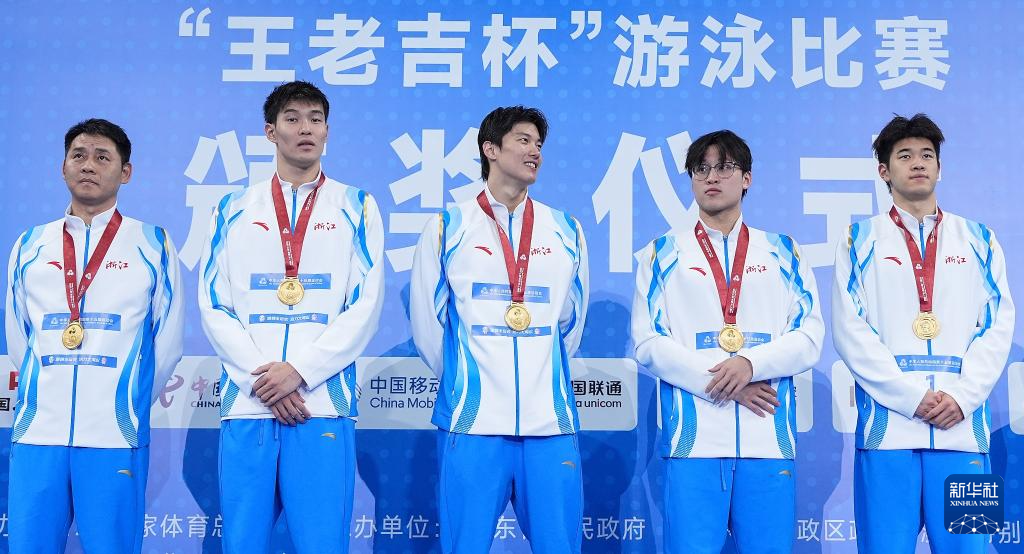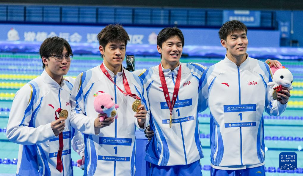 11月10日,冠军浙江队选手沈加豪(左一)、潘展乐(左二)、汪顺(左三)、何峻毅在颁奖仪式后合影留念。