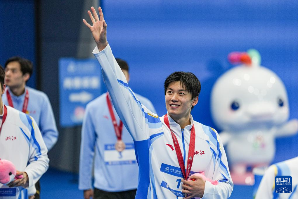 11月10日,浙江队选手汪顺(前)在赛后向观众挥手致意。最终,浙江队获得冠军。