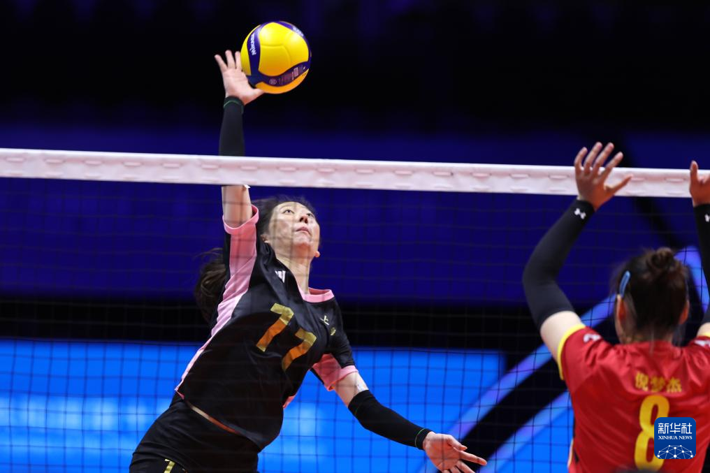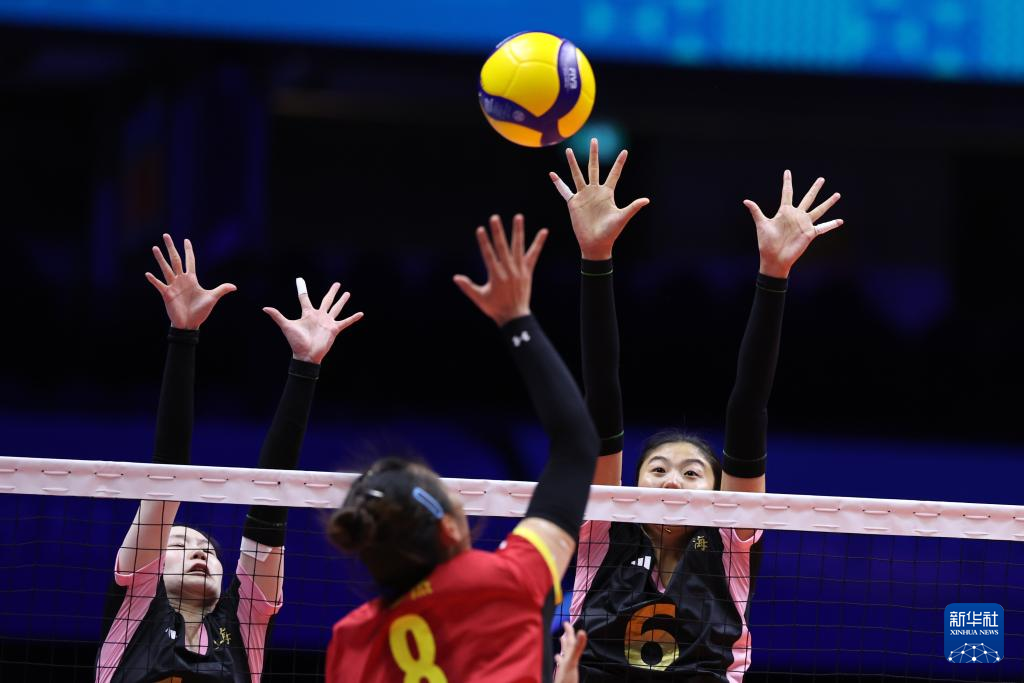 11月11日,浙江队球员张红紫嫣(左)在比赛中拦网。