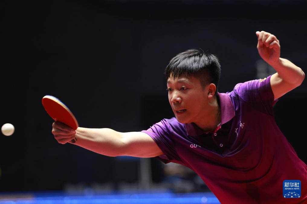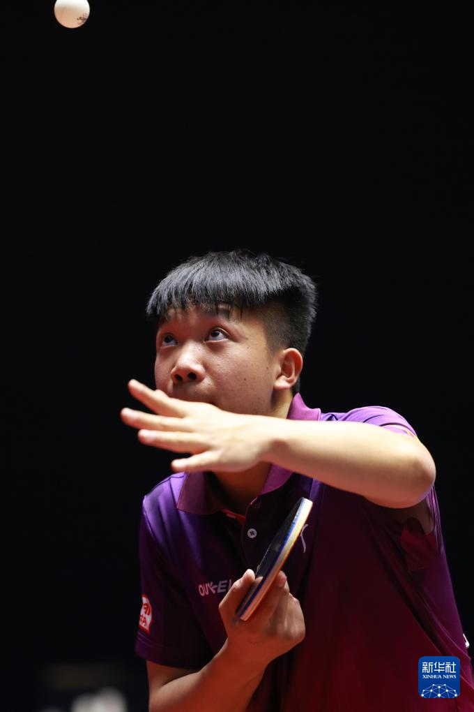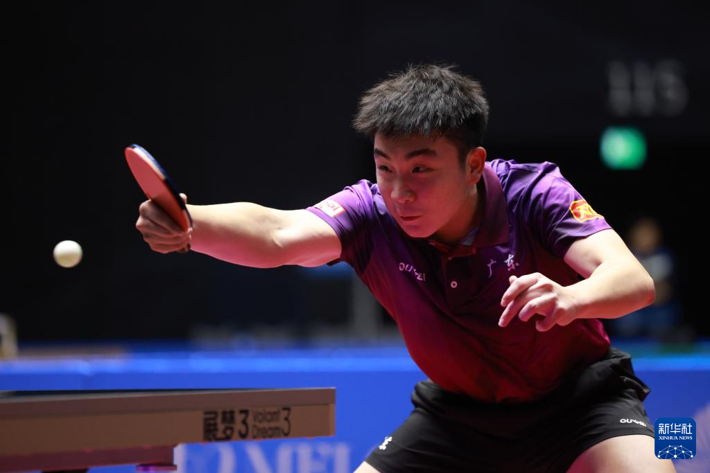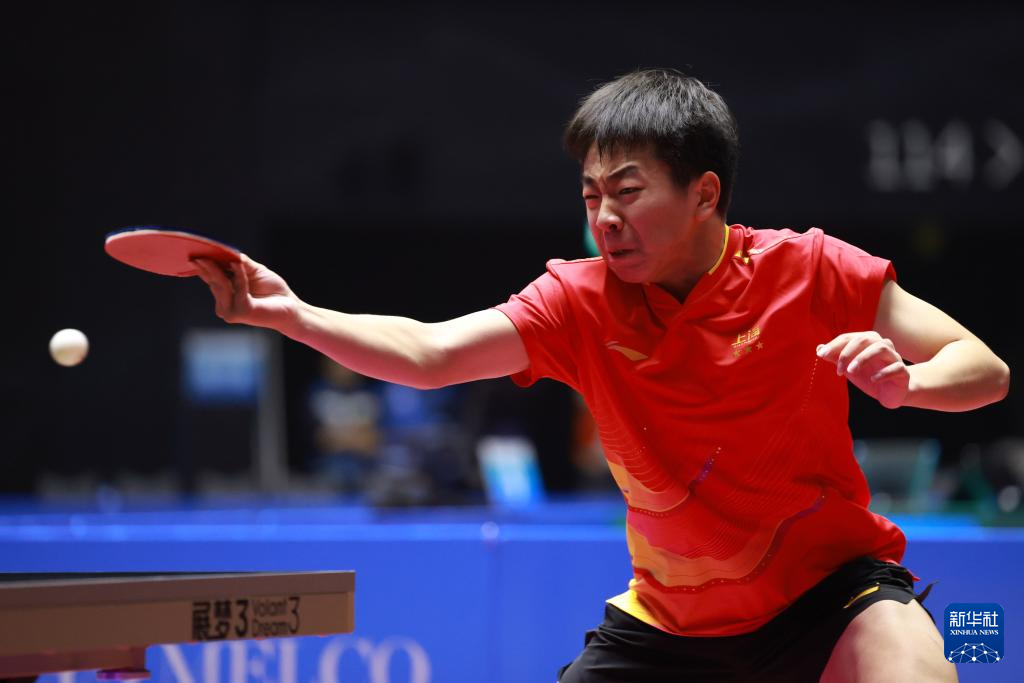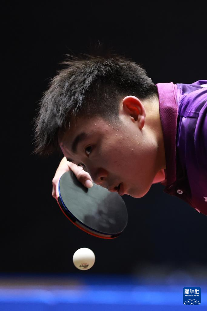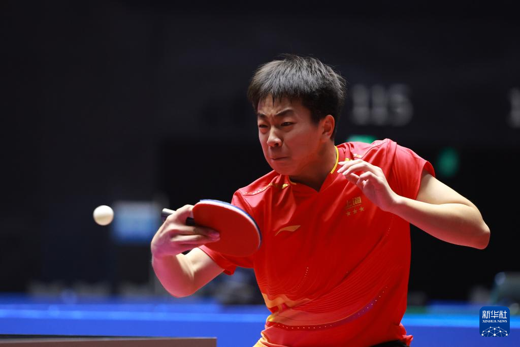 11月12日,广东队选手王栋在比赛中回球。