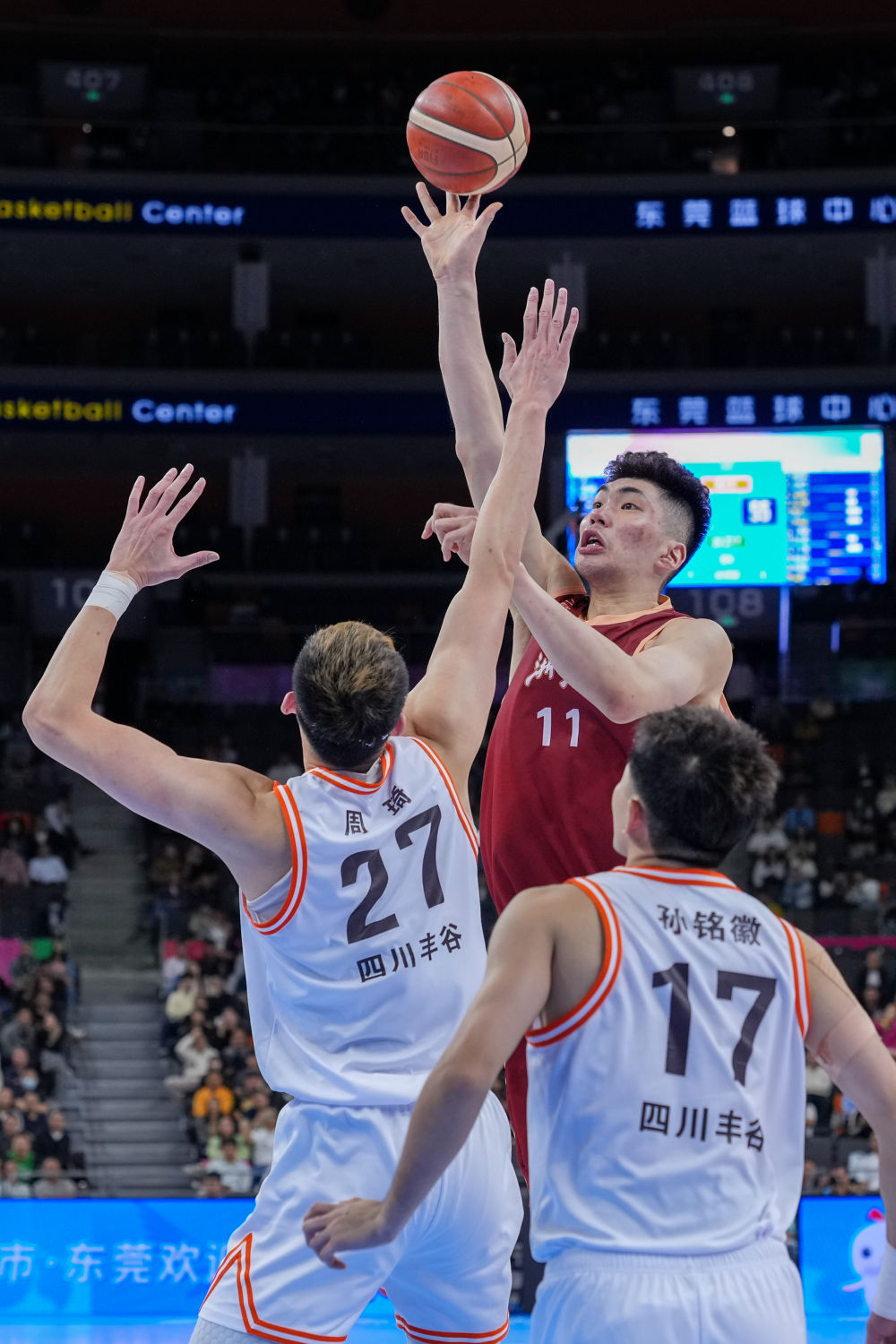 11月11日,浙江队球员余嘉豪(中)在比赛中上篮。新华社记者 李博 摄