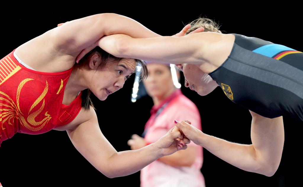 2021年8月1日,中国选手周倩(左)与德国选手阿琳在摔跤项目女子76公斤级四分之一决赛中。当日,东京奥运会摔跤项目开赛。新华社记者 王毓国 摄