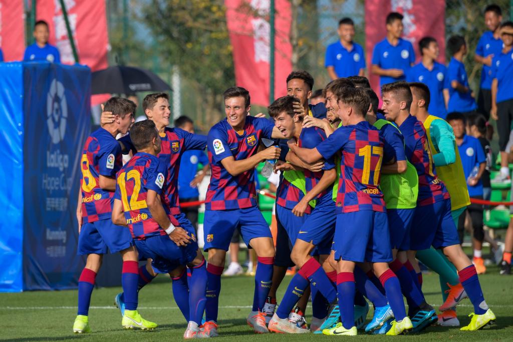 2019年8月21日,巴塞罗那俱乐部U16队球员在进球后庆祝。当日,西甲希望杯中国(昆明)赛在云南省昆明市开幕。在当日的揭幕战上,巴塞罗那U16队以1比0战胜塞维利亚U16队。新华社记者 胡超 摄