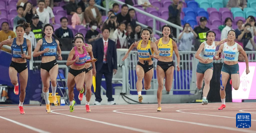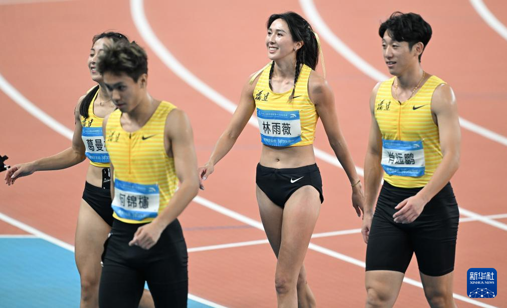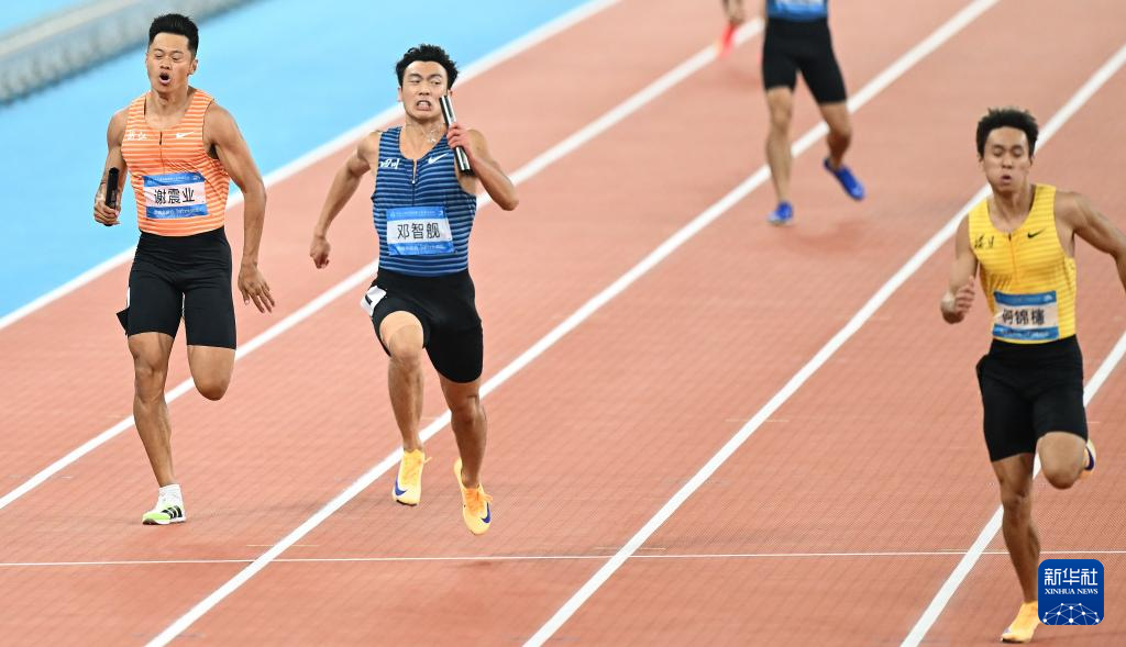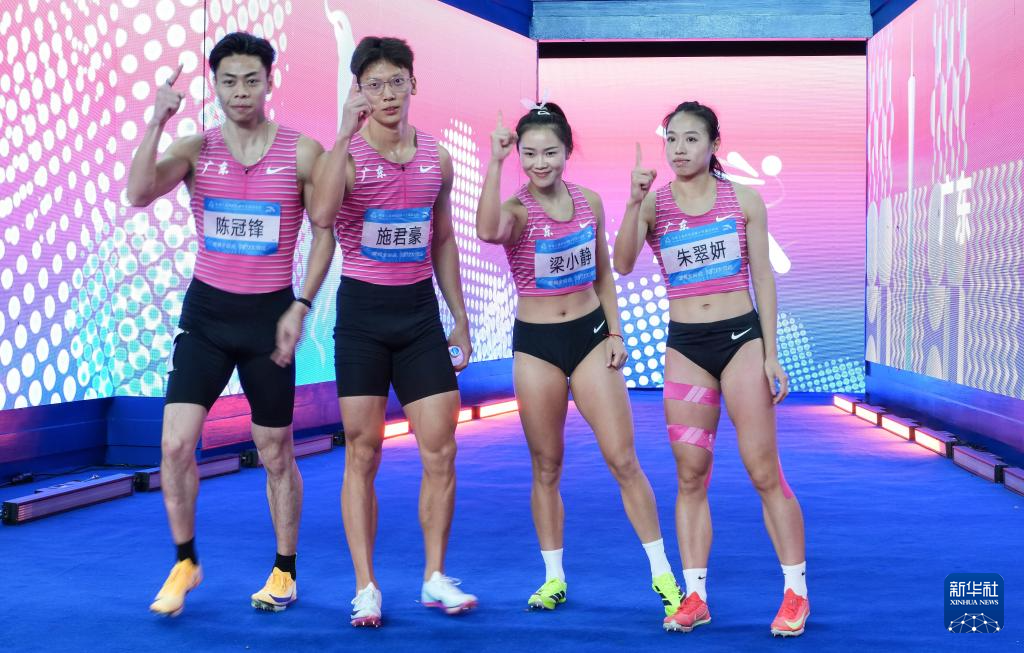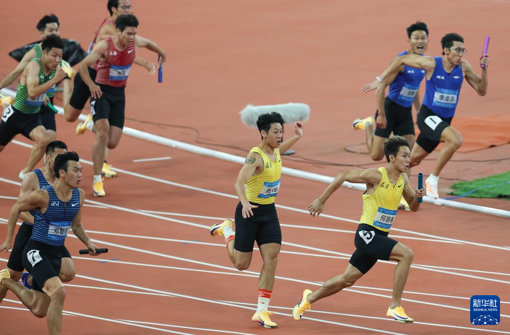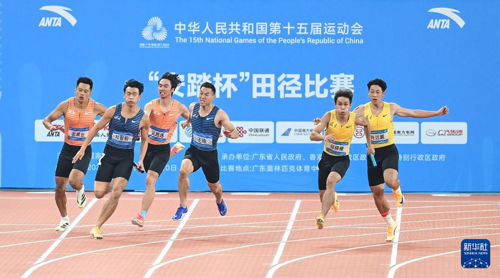 当日,第十五届全国运动会田径4X100米混合接力决赛在广州举行。
