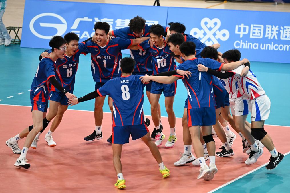 11月14日,黑龙江队球员在比赛胜利后庆祝。当日,在广州举行的第十五届全国运动会排球男子18岁以下组四分之一交叉赛中,黑龙江队3比2战胜河南队。新华社记者 周牧 摄