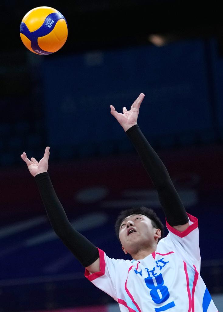 11月12日,黑龙江队球员王跃达在比赛中组织进攻。当日,在广州举行的第十五届全国运动会排球男子18岁以下组小组赛B组比赛中,浙江队3比0战胜黑龙江队。新华社记者 李一博 摄