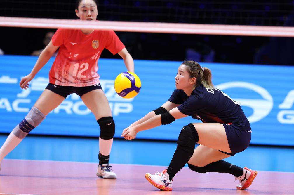 11月15日,江苏队自由人倪非凡(右)在比赛中救球。当日,在澳门举行的第十五届全国运动会排球女子成年组小组赛中,江苏队3:1战胜天津队。新华社记者 陈斌 摄