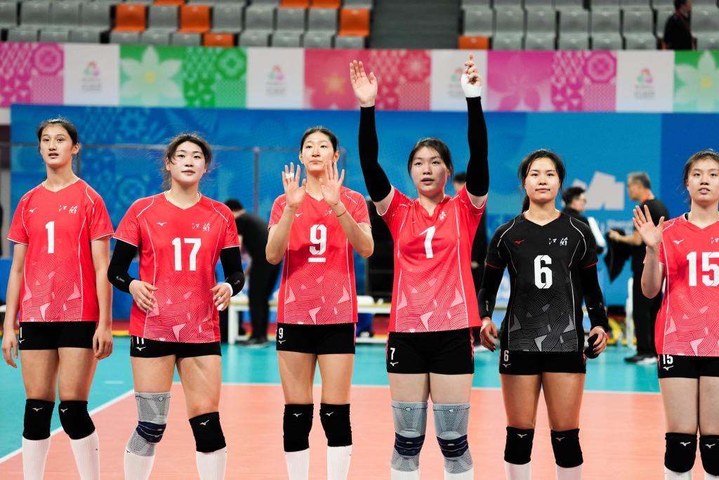 11月13日,江苏队球员在比赛后向观众致意,右二为刘茗月。当日,在深圳进行的第十五届全国运动会排球女子18岁以下组小组赛中,江苏队3:0战胜四川队。新华社记者 陈思汗 摄
