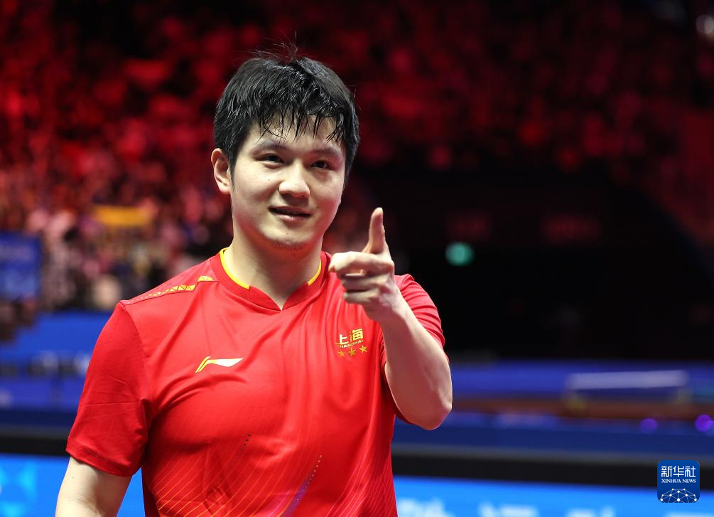 11月16日,上海队选手樊振东庆祝获胜。新华社记者 陈斌 摄