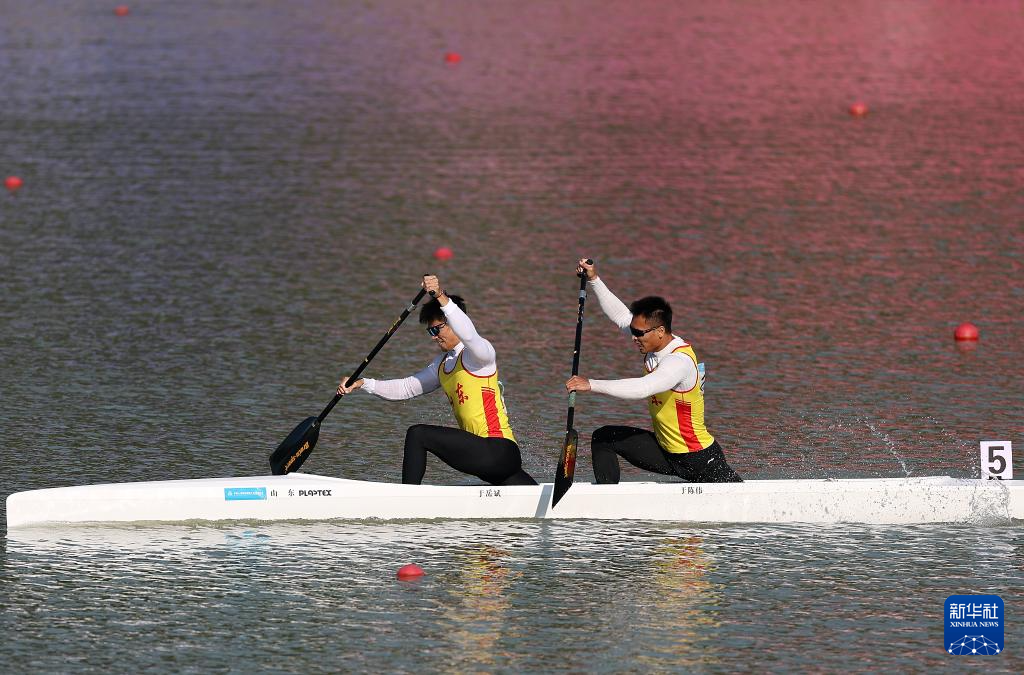 11月17日,山东队选手于岳斌(左)/于陈伟在男子500米双人划艇决赛A中。最终,他们夺得冠军。