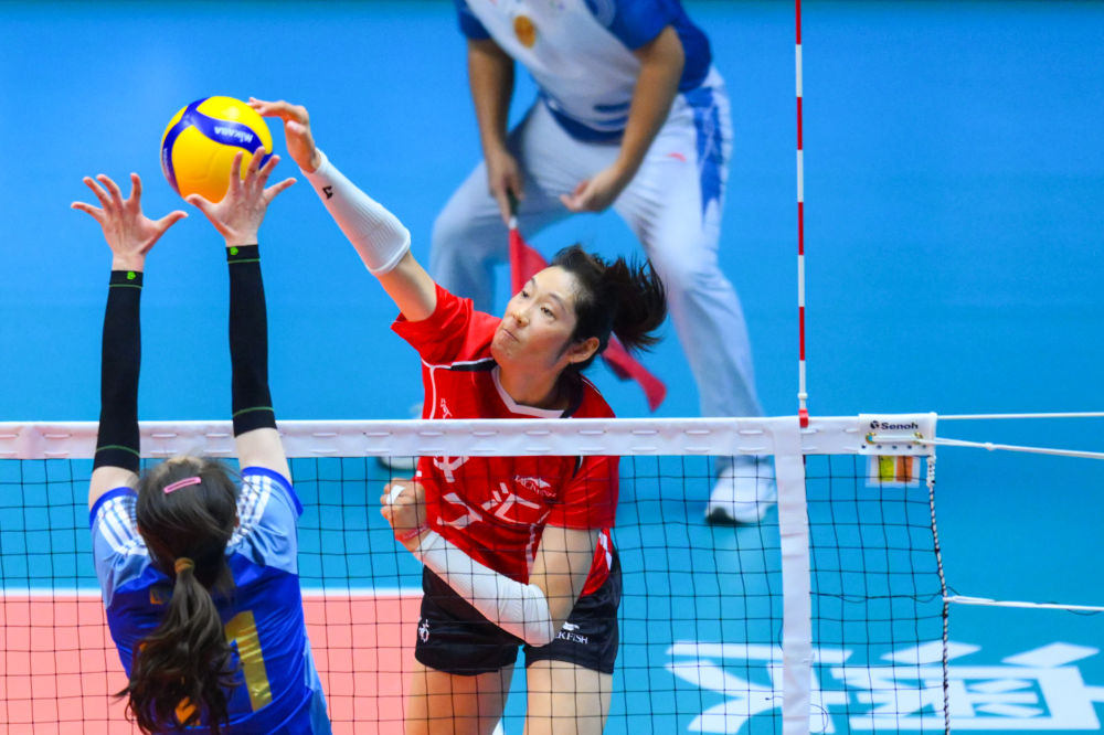 11月17日,河南队球员朱婷(右)在比赛中进攻。新华社发(张金加摄)