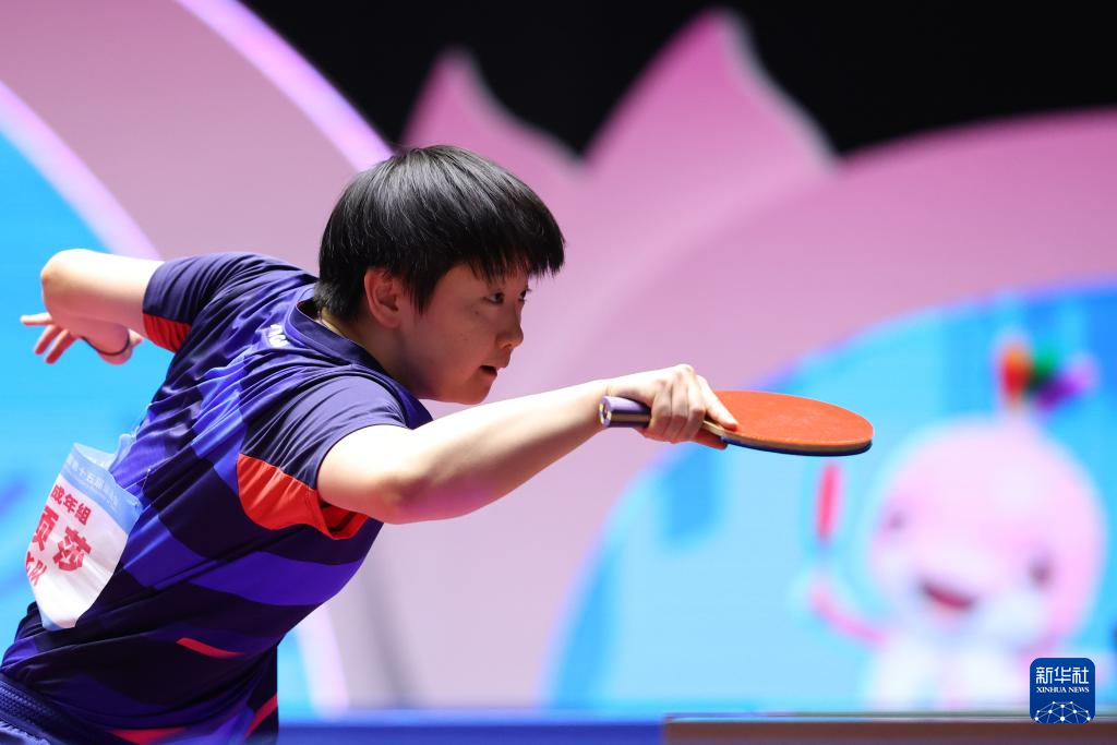 11月18日,河北队选手孙颖莎在比赛中回球,她在单打比赛中3比0战胜辽宁队选手刘斐。