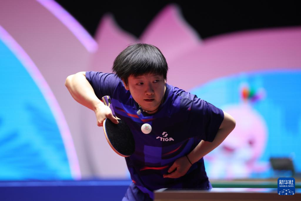 11月18日,河北队选手孙颖莎在比赛中回球,她在单打比赛中3比0战胜辽宁队选手陈幸同。