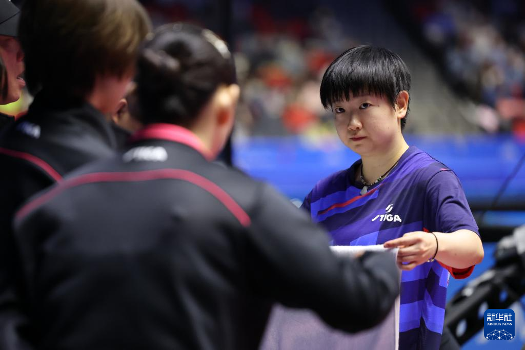 11月18日,河北队选手孙颖莎在比赛暂停阶段与队友交流,她在单打比赛中3比0战胜辽宁队选手陈幸同。