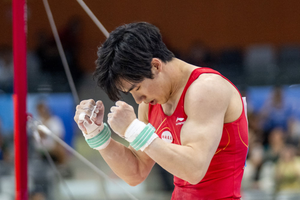 男子单杠决赛是当晚焦点,此前比赛日未能摘金的张博恒出战。他做出多个高难度动作,平稳落地之后紧握双拳庆祝,以14.860分夺冠。江苏队何翔、北京队肖若腾分获银牌、铜牌。